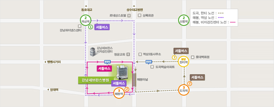 병원 출발 | 매봉역(3호선) 2번 출구로 나와서 파파존스 앞 | 역삼역(2호선) 1번출구 뒷편 약10m (*선릉역방향) |