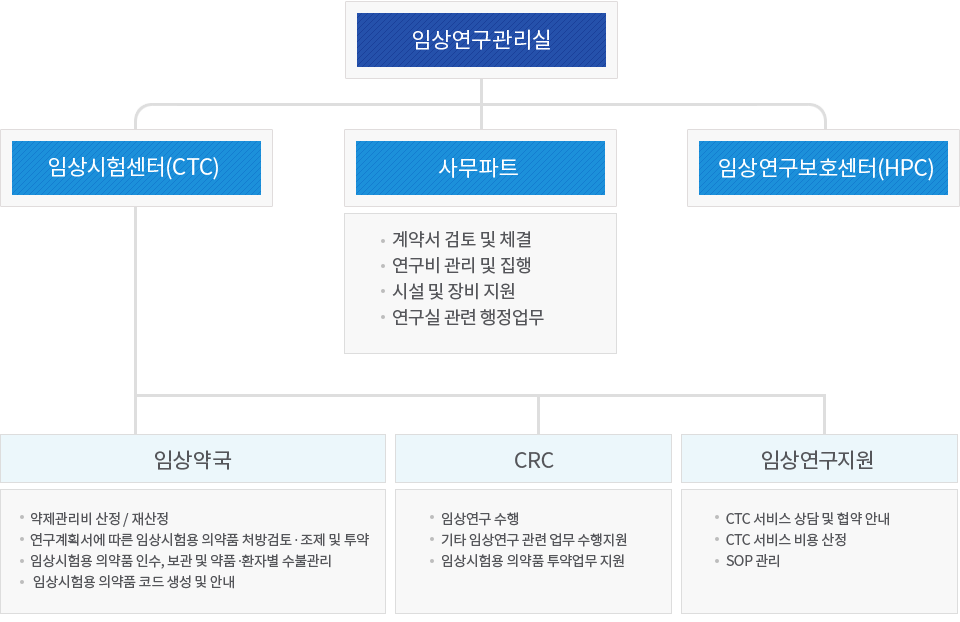 센터소개 센터소개 인사말 성과실적 조직도 및 업무별 연락처 오시는 길 조직도 및 업무별 연락처 센터소개 조직도 및 업무별 연락처 임상시험센터는 고객에게 최선의 서비스를 제공하기 위해 노력하고 있습니다. 임상시험센터 업무 전화번호 이메일 계약서 관련 02-2019-4602 센터시설이용 관련 02-2019-4858 센터투어 관련 02-2019-4858 연구비 관련 02-2019-4602 인증서 관련 02-2019-4858 임상연구처방코드(CR코드) 관련 02-2019-4602 임상연구 수가 안내 관련 02-2019-4628 임상연구용 검체관리 관련 02-2019-4858 의료기기임상시험 관련 02-2019-4858 장기문서보관 관련 02-2019-4858 CRC 종사자 교육 관련 02-2019-4632 CRC 지원 관련 02-2019-4628 CRC 서비스 협약 관련 02-2019-4628 EMR ID(CRA, CRC) 발급 02-2019-4858 임상시험센터 약국 02-2019-2929
