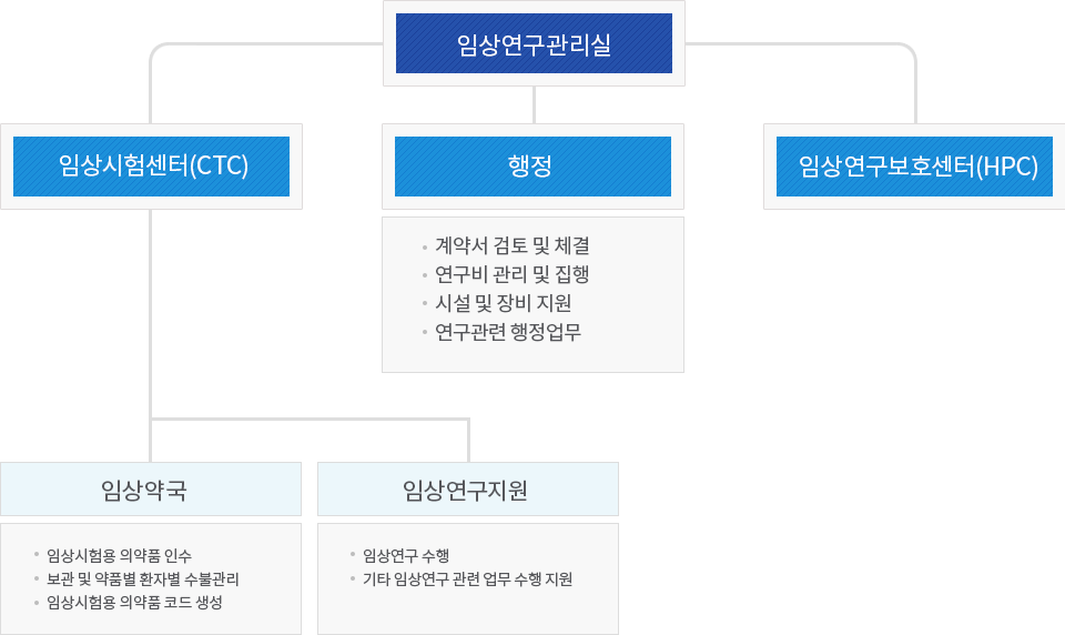 센터소개 센터소개 미션과 비전 조직도 및 업무별 연락처 오시는 길 조직도 및 업무별 연락처 센터소개 조직도 및 업무별 연락처 임상시험센터 업무 전화번호 임상시험센터 [행정] 031-5189-8893, 8894 임상시험센터 [약국] 031-5189-8833