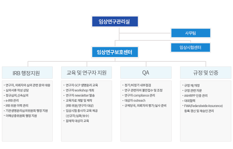 센터소개 센터소개 인사말 조직도 및 업무별 연락처 조직도 및 업무별 연락처 센터소개 조직도 및 업무별 연락처 임상연구의 과학적, 윤리적 수행과 체계적인 대상자 보호를 위해 최선의 노력을 다하고 있습니다. 임상연구보호센터 업무 전화번호 이메일 교육 관련 02-2228-0433~4 규정 및 인증 관련 02-2228-0453~4 IRB 지원 관련 02-2228-0431~8 QA 관련 02-2228-0450~2