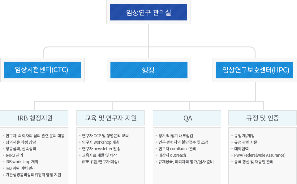 센터소개 센터소개 미션과 비전 조직도 및 업무별 연락처 조직도 및 업무별 연락처 센터소개 조직도 및 업무별 연락처 업무별 연락처 업무 전화번호 IRB 관련 031-5189-8891 ~ 2 규정 및 인증 관련 031-5189-8891 ~ 3 교육 관련 031-5189-8893 QA 관련 031-5189-8893